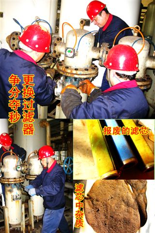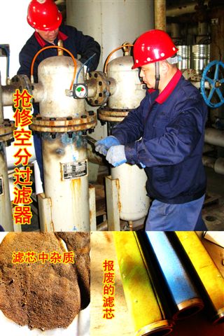 他们中间既有“技能大师”、市级“五一劳动奖章”获得者设备“医学专家”—伏彩兵,也有不见经传的普通一线维修员工。近期,公用工程部人员发现1#空分制氮机组气压降低1个表压,能耗上升,氮气纯度和产气量双降,有报警停车隐患,经维修和自主维修“医生”紧急会诊,诊断为“芯梗”,需要立即“换芯”(更换空气过滤器滤芯),面对突发情况,为保证生产安全运行,维修人员自觉加快维修进度,加班加点开展滤筒解体,吊装,换芯,复位等工作,提前两小时完成抢修任务,原“芯梗”制氮机组进气运行后压力恢复正常,隐患解除。