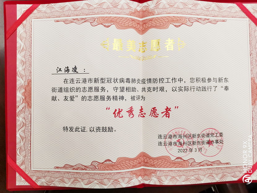 新东街道党工委、新东街道办事处联合为荣誉获得者颁发纪念证书,同时予以表扬,新东街道提到:市工投集团台北投资公司党员江海凌同志最肯吃苦,最能战斗。他每天早上到的比谁都早,晚上回的比谁都晚,与社区工作人员一道进楼入户排查信息,仔细询问居民生活物品需求情况并予以解决,还认真参与卡点防控值守、小区巡逻、做好小区出入人员体温检测、登记消杀出入车辆等一线工作。在疫情最后阶段,大部分志愿者撤离,江海凌仍在“逆行”,成为小区居民物资保障志愿者,每天为广大居民“菜篮子”保驾护航,江海凌是勇于担当的逆行者,是最美志愿者。
