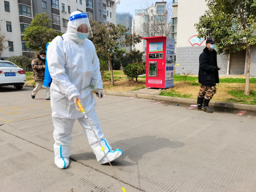 孙银:“请大家抬一下脚,靠边站一下,我将您的周围喷洒消毒液进行消毒,谢谢配合!”