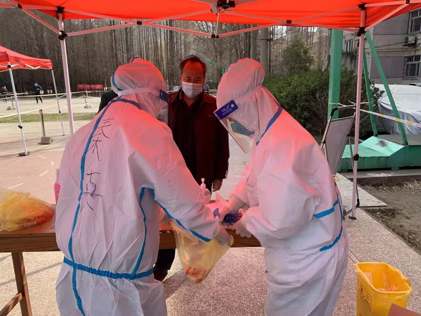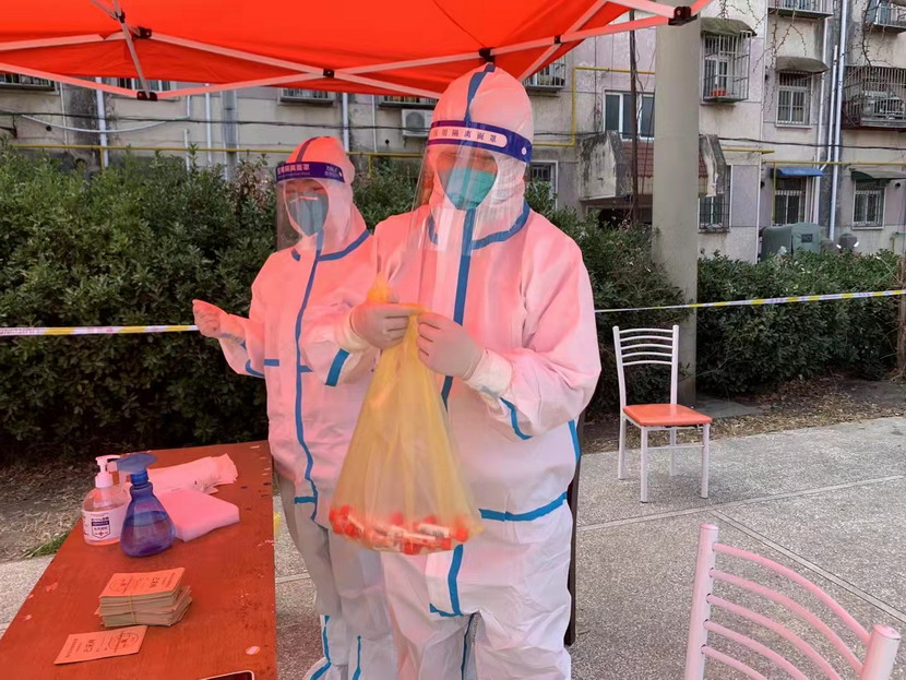 然而随着疫情越发严重,小区核酸检测员人手又紧张了起来,“我可以,这几天我都学会了,最基本的我都会”秦英又是第一个举手到最前线。这下她更忙了,每天凌晨三点起床做饭,五点社区报到,一直坚守到晚上八点。为了节省防护服,她一般都要等到中午2点多钟才休息吃饭,这股毅力让社区、街道领导看在眼里,服在心上,连一直牢骚怪话的几个群众也为她由衷地竖起大拇指。