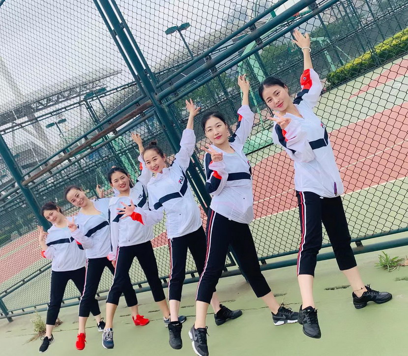 ▲ 平日里带领“工投舞蹈队”训练的秦英(右三)