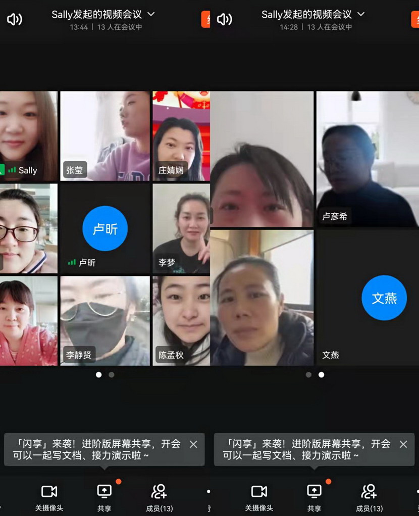 线上贡献篇。“纵然居家隔离,一样不防碍我们做贡献,我们线上服务已经开启”三八节这一天,在社区忙碌一天的公司女工委副主任宋文静又特意安排了“三八”节线上活动。这一天活动精彩纷呈:首先是视频连线,通过广大女工并向她们家人传达市委市政府以及集团党委、投资公司党委关于疫情防控文件精神。其次共同学习全国“两会”会议精神。第三,开展公司“三新”解放思想大讨论线上论坛,围绕疫情防控、生产经营,尤其是企业转型发展出谋划策。最后还来了点小游戏-成语“飞花令”,给严肃的疫情防控增添了一息欢乐的氛围。