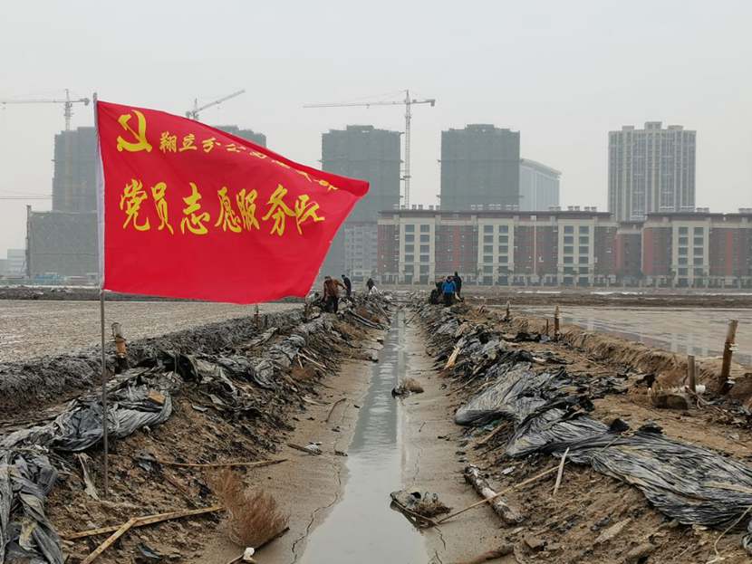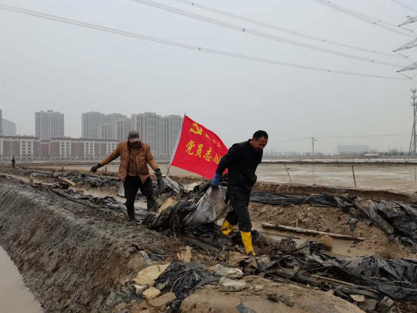 劳动现场,鲜红的“党员突击队”旗帜迎风飘扬,凛冽的寒风夹杂着细雨,丝毫不减大家的劳动热情,个个汗流浃背、满身泥浆,不怕脏不怕累,经过3个小时的突击劳动,共清理1200米、16车池埝垃圾。